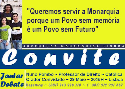 [ Nuno Pombo é o próximo Orador Convidado para o Jantar/Debate da Juventude Monárquica de Lisboa, no dia 29 de Maio pelas 20 Horas. Todos os meses a Juventude Monárquica marca encontro no Restaurante Petit Folie em Lisboa, com o objectivo de incrementar as tradicionais tertúlias, o confronto de ideias para o debate mensal dos assuntos da actualidade. Cabe a cada Orador, traçar os conteúdos e matérias do debate, que por vezes são resultantes da experiência de cada um. O que o Professor de Direito da Universidade Católica, Nuno Pombo, promete trazer à mesa de debate, fica por revelar após este Jantar que a Juventude Monárquica está a organizar, de modo a dar continuidade à serie de debates anteriormente bem sucedidos. Não se pode afirmar que a Juventude Portuguesa está de todo afastada ou de costas viradas, à discusão de assuntos referentes às novas políticas sociais. A Juventude Monárquica, vai marcando cada vez mais e duma forma crescente, novos rumos, apresentando um novo fôlego quanto à sua futura alternativa política, enquadrando-a nas actuais questões do Séc. XXI, e para que sejam sempre estas, também matéria de debate. O que os anima? É certamente... projectar o Futuro! A sociedade mudou, e o grande desafio destes jovens, consiste em mudar também a imagem de Portugal. Destes encontros, fizeram já parte como oradores: Filipe Avillez; Gonçalo Sampaio Mello; João Gomes (Dirigente da Juventude do PS); Miguel Soares (Dirigente da Juventude Popular); João Mattos e Silva (Ex. Presidente da Causa); António Sousa Otto (Fundador do PPM); João Cunha Coutinho (Fundador Núcleo Monárquico Faculdade de Medicina); Rui Araújo (Secretário da Comissão Executiva da Causa Real), entre outros. Ricardo Abranches vê assim confirmada na Juventude a sua grande aposta na continuidade do projecto Monárquico que defende.